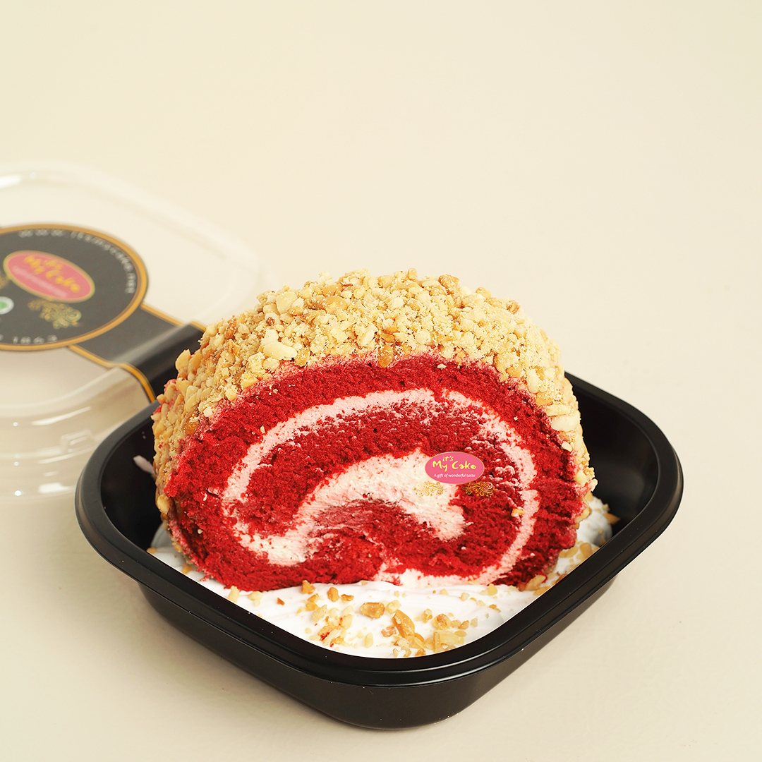 Red Velvet Sponge Cake with lemon cream rolled up and covered with peanuts