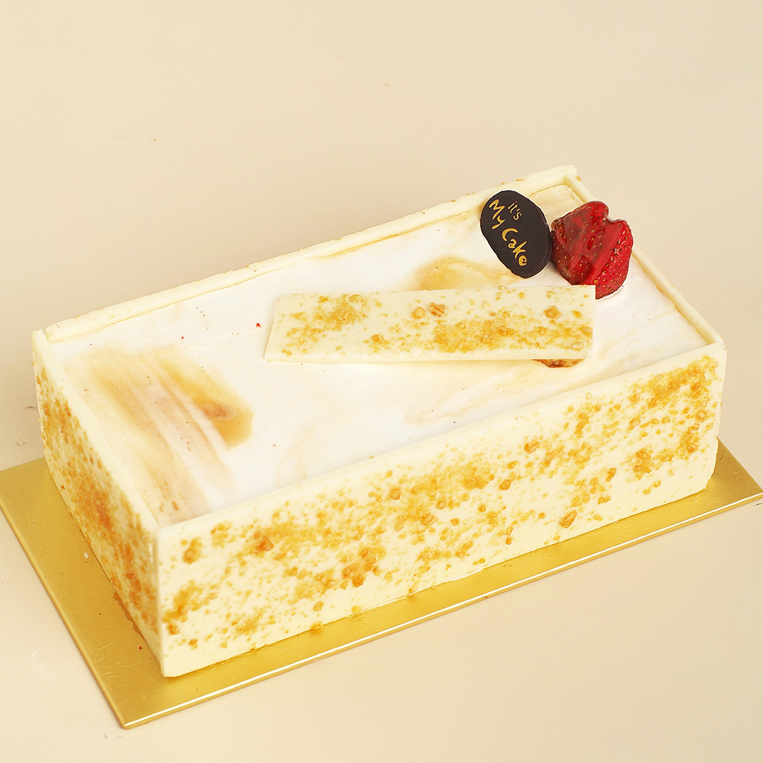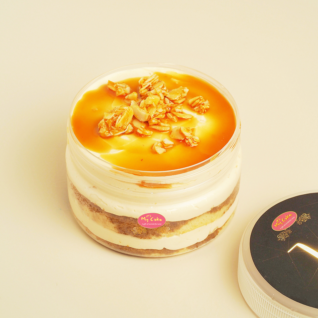Vanilla sponge cake doused with coffee liquid, caramel cream mousse and caramelized almonds in each layer, garnished with white compound almond. Stored in the freezer, please serve it still cold to get a more delicious taste.