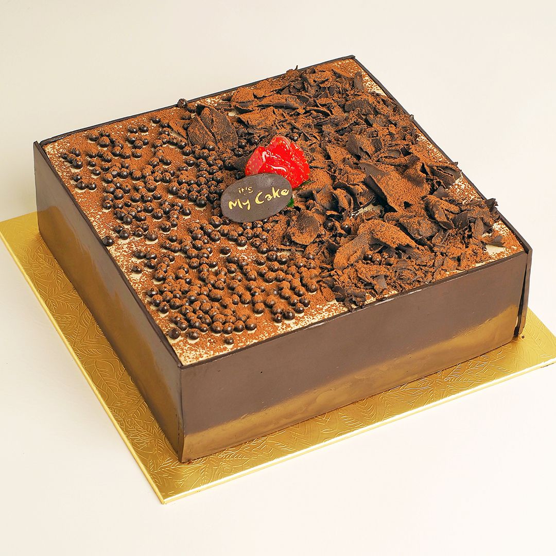 Chocolate sponge cake, our special chocolate mousse in each layer, decorated with dark chocolate compound, topped with shaved chocolate, chocolate crispy balls and sprinkled with cocoa powder. Stored in the freezer, please serve cold for a better taste.