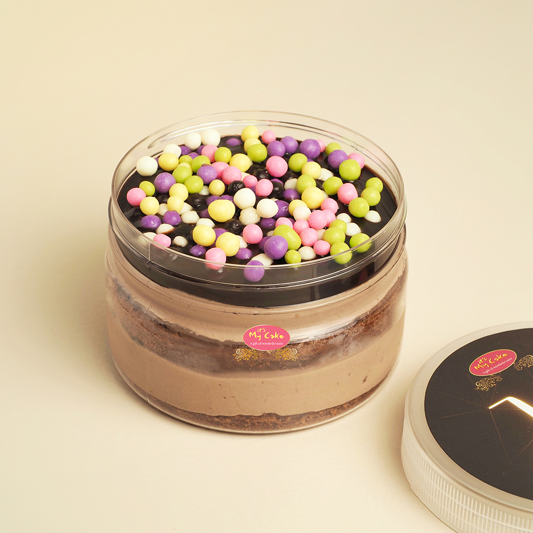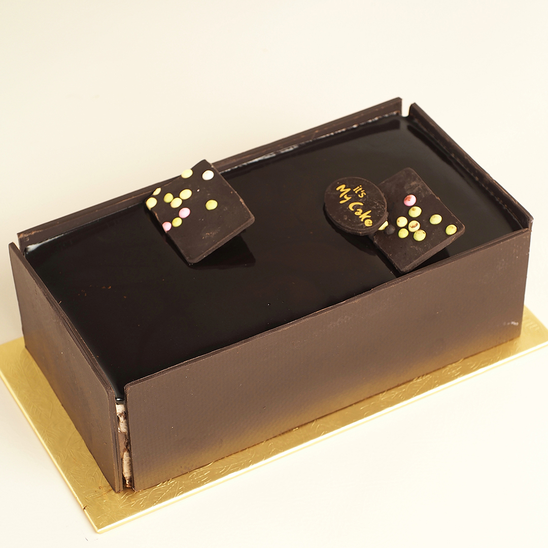 Chocolate sponge cake, special chocolate milk mousse and colorful crispy balls in each layer, decorated with dark chocolate compound, and topped with mirror chocolate. Stored in the freezer, please serve cold for a better taste.