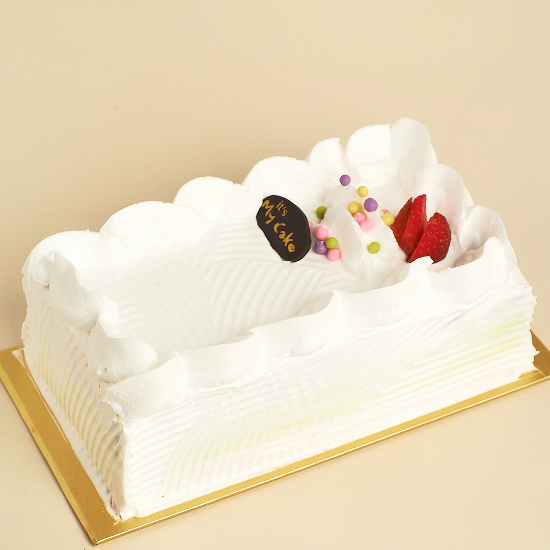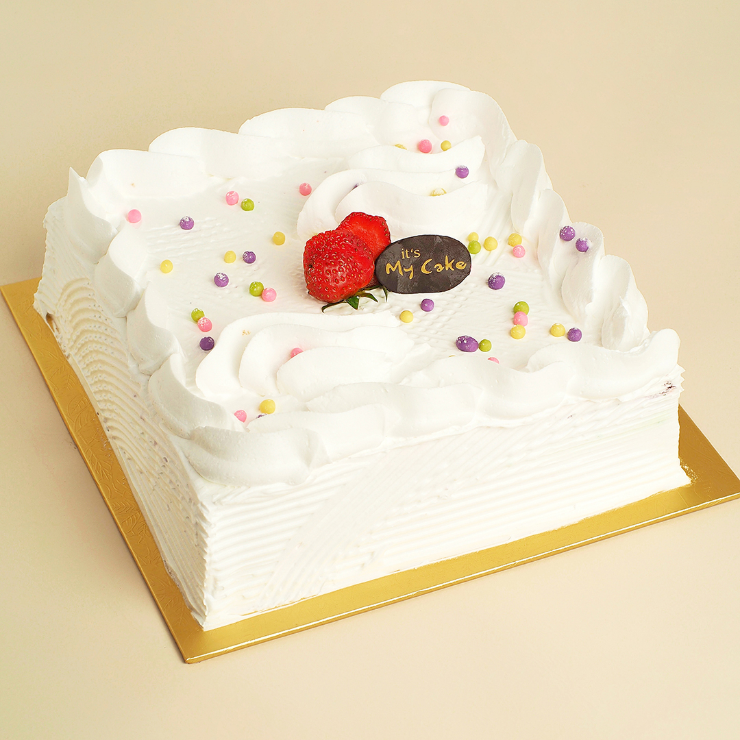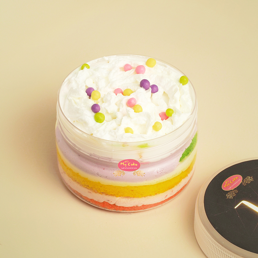 Rainbow sponge cake, strawberry blueberry cream mousse and cream cheese in each layer, decorated with whipped cream.