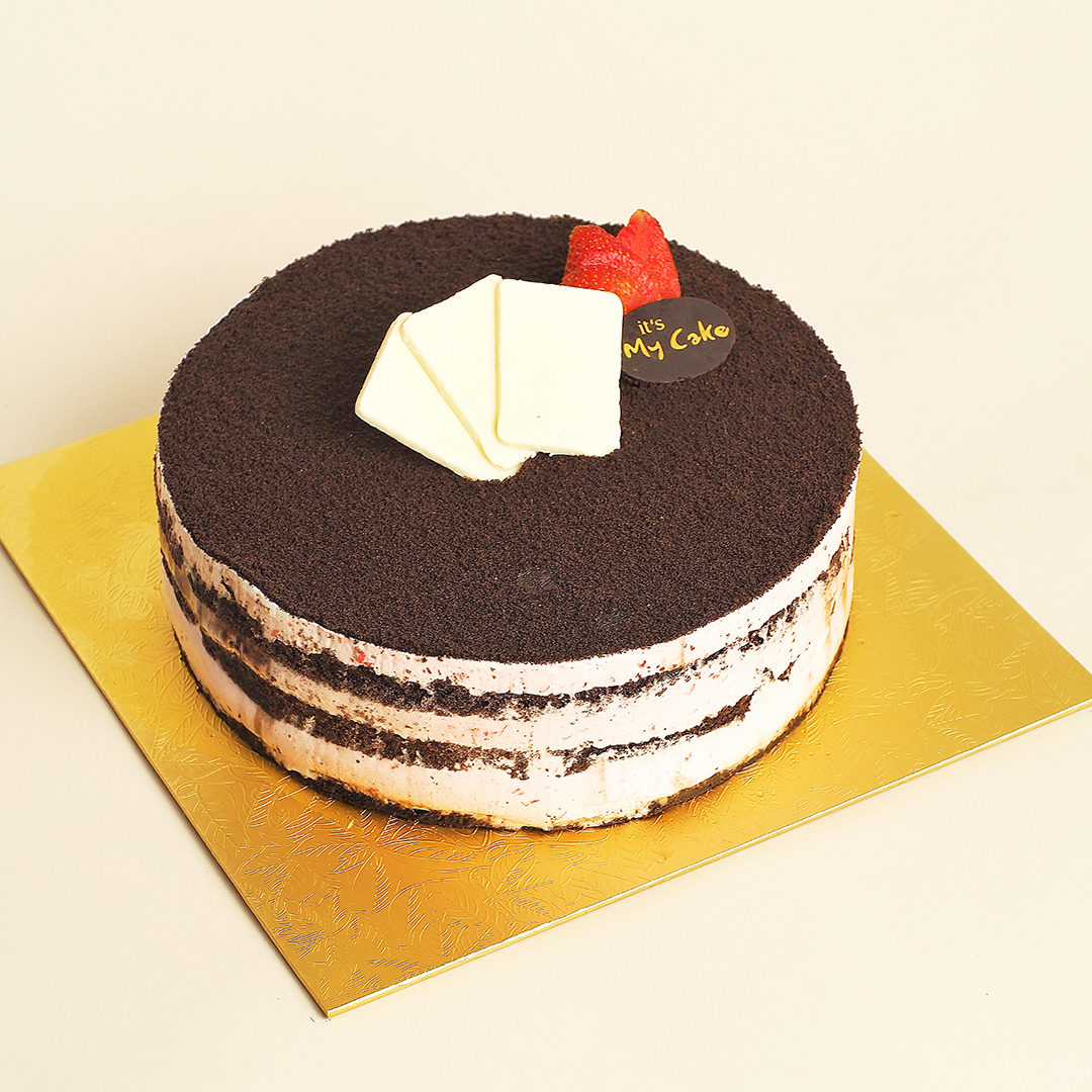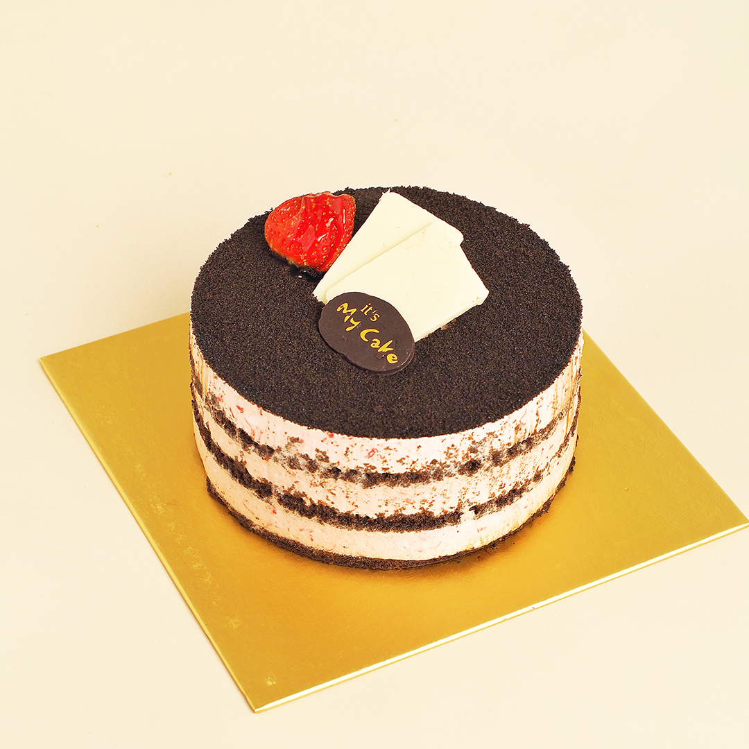Brownies covered with chocolate glaze and layered with strawberry cream mousse, sprinkled with crumbled black cookies. Please serve it still cold so that it is more delicious
