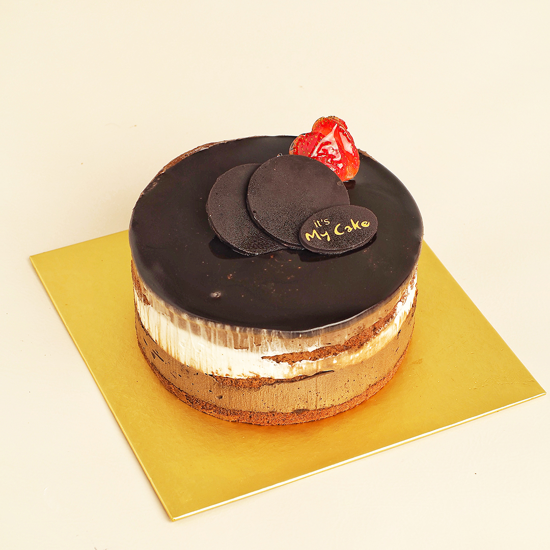 chocolate sponge cake with chocolate and white mousse on each layer, mirror chocolate topping and decorated with dark chocolate compound. Please serve it in a cold state so that it is more delicious.