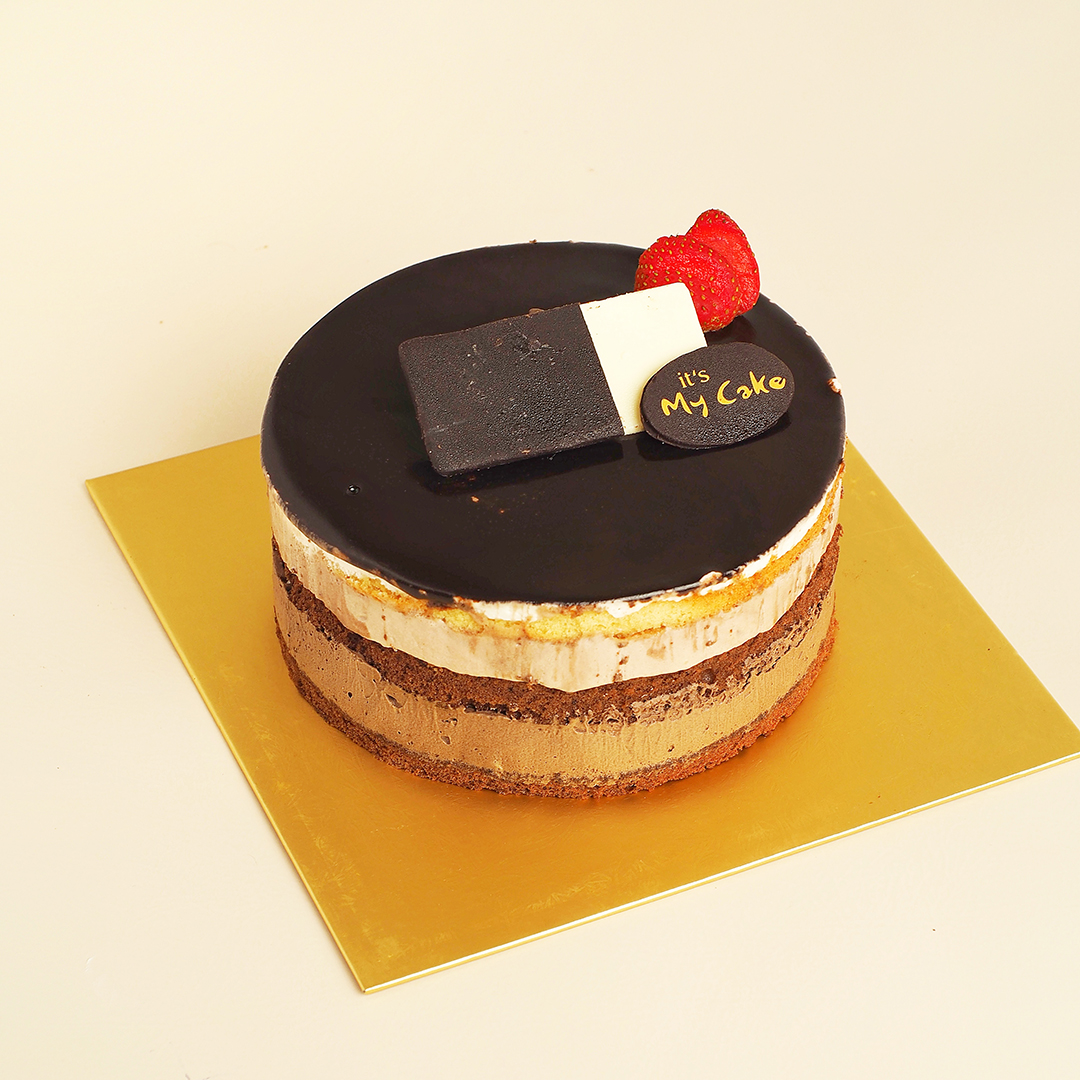 Sponge cake with, three layers of dark, milk & white chocolate mousse and crispy balls of three flavors in each layer, decorated with mirror chocolate topping. Stored in the freezer, please serve cold for a better taste.