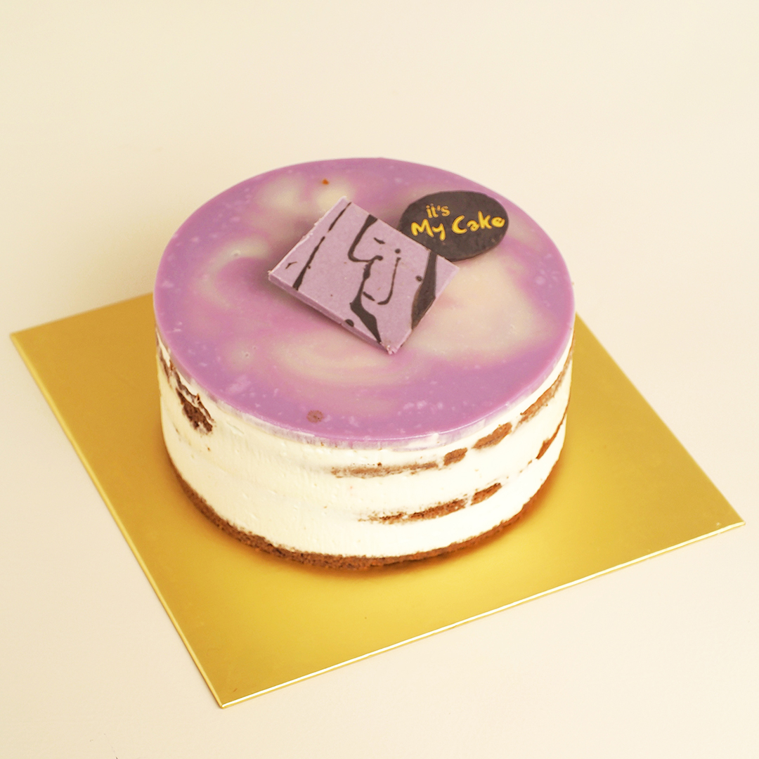 Sponge cake with cream cheese mousse and white chocolate mousse on each layer, decorated with purple chocolate coating and dark chocolate compound. Stored in the freezer, please serve it still cold for a better taste.